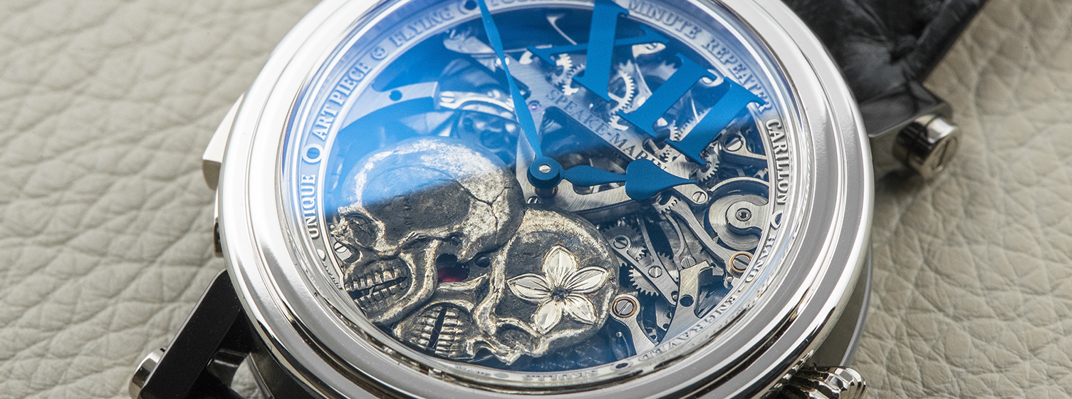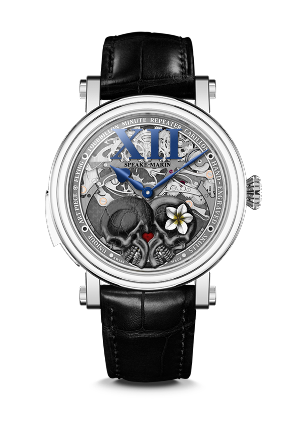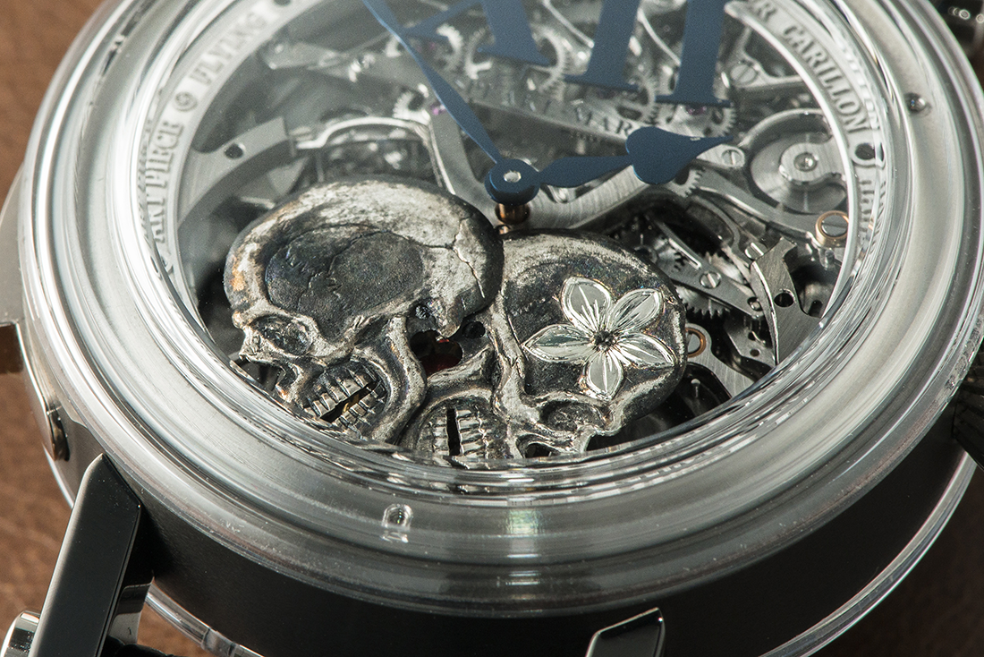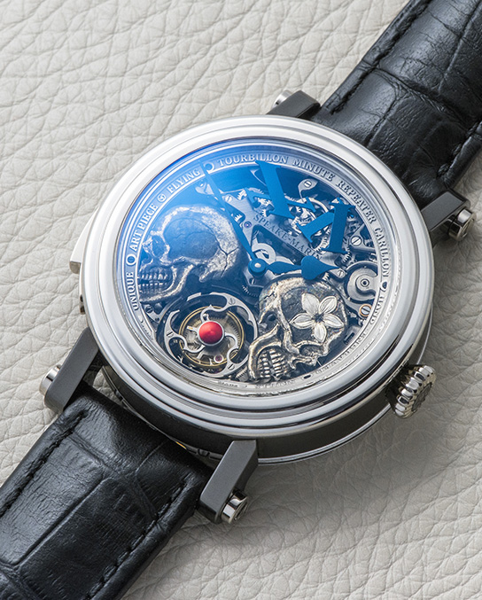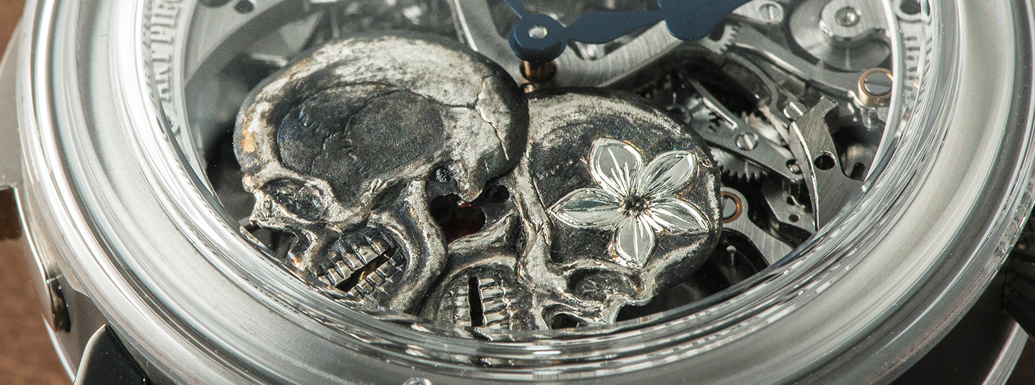 Skeletonized dial with two hand-engraved skulls in aluminium. Big index at 12.