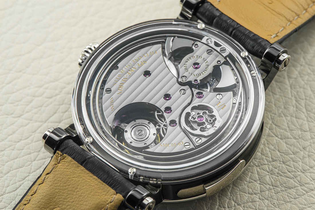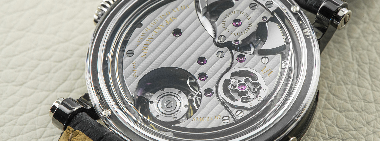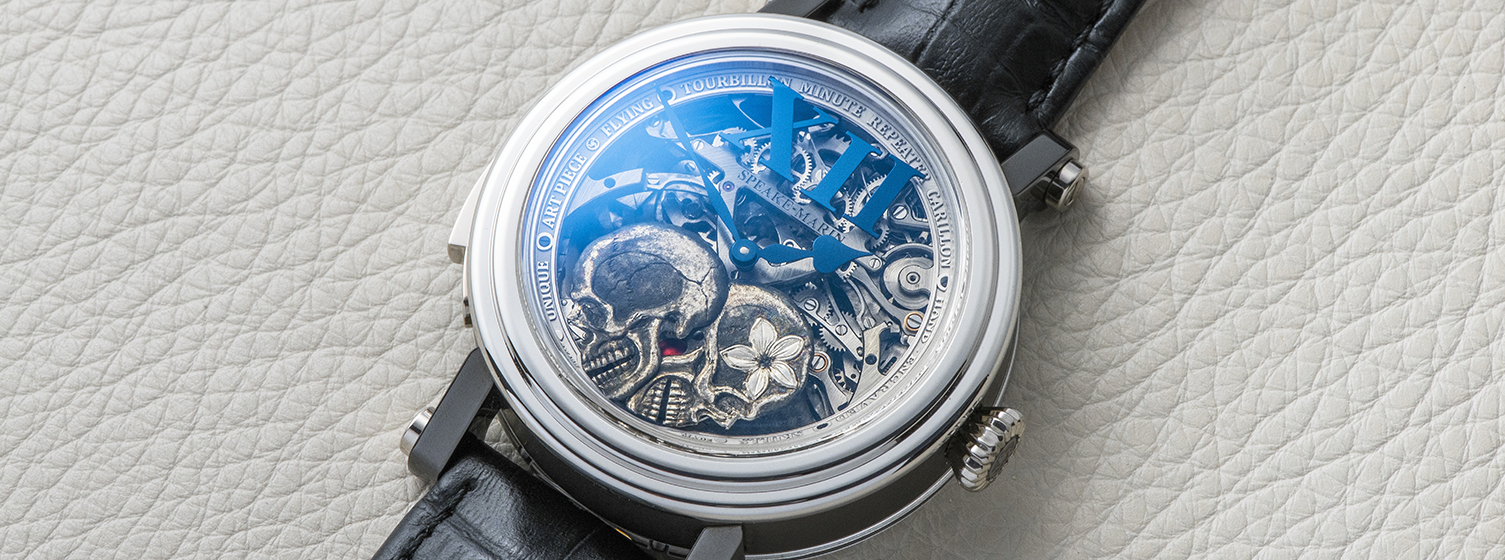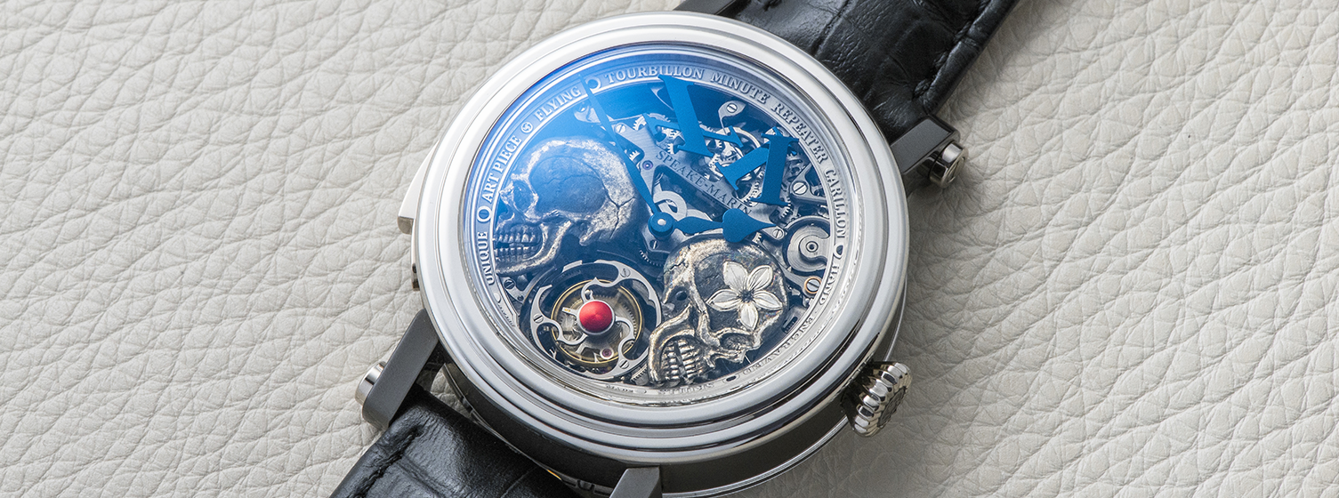 Skeletonized dial with two hand-engraved skulls in aluminium. Big index at 12.