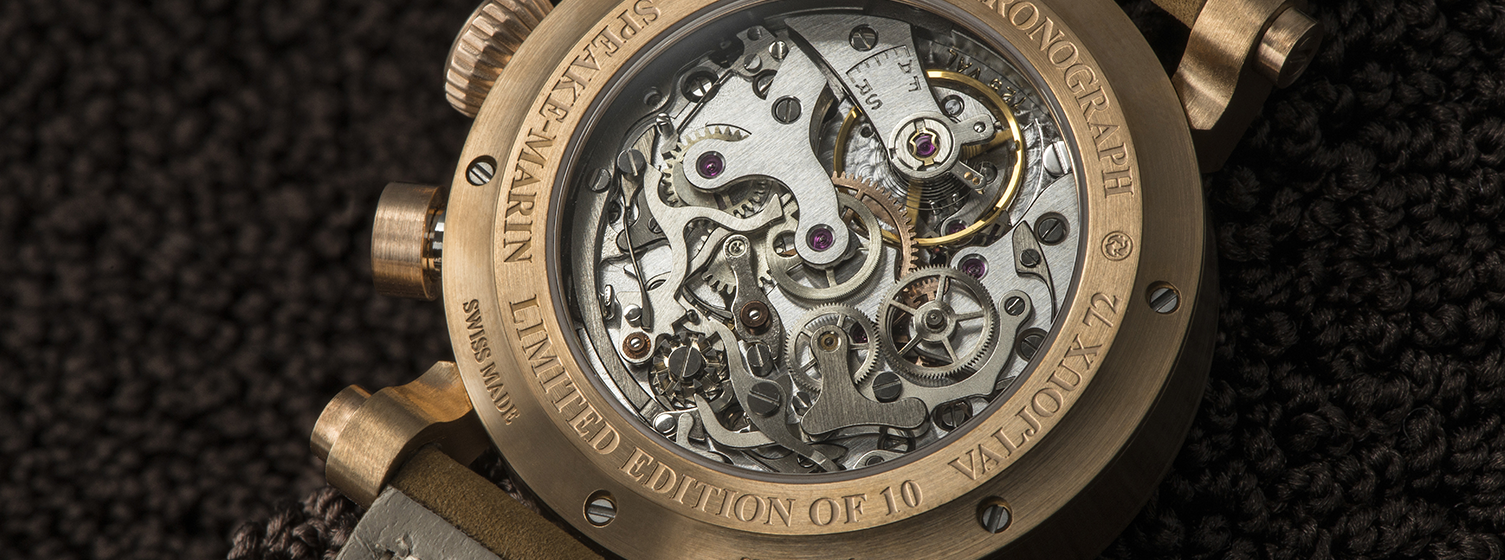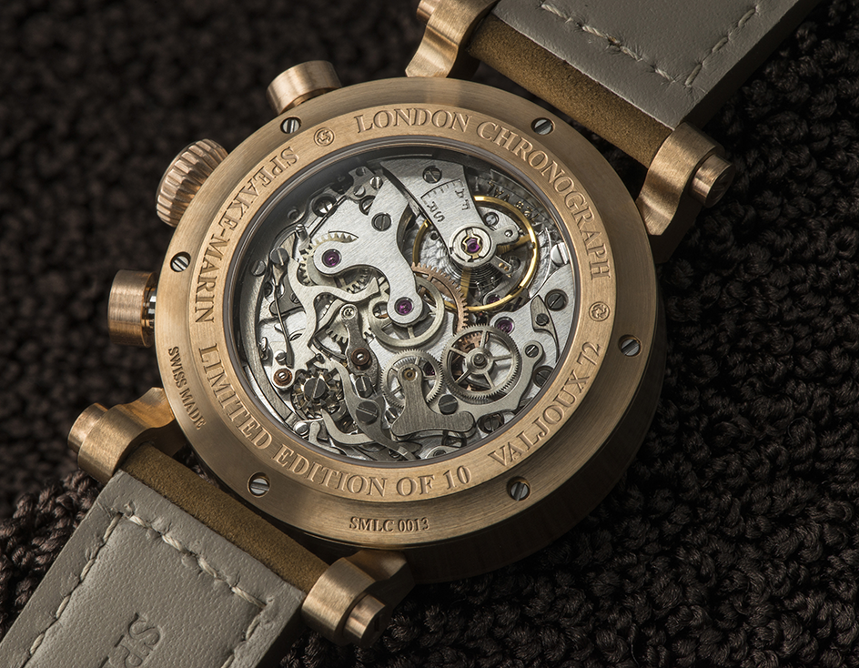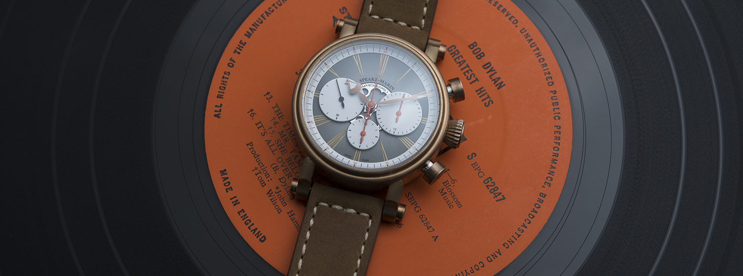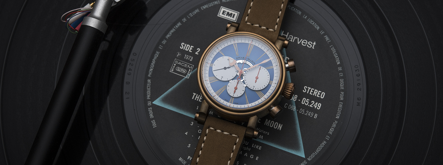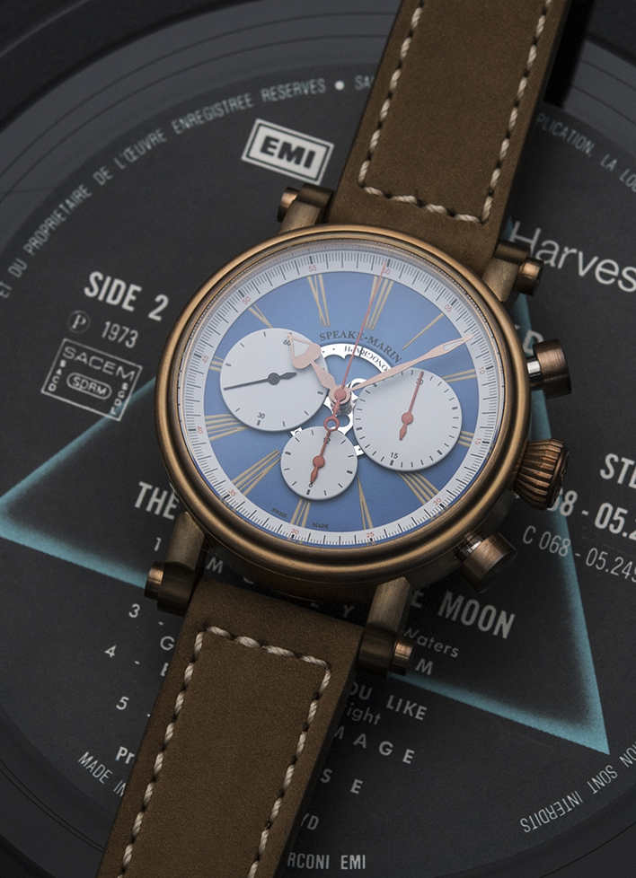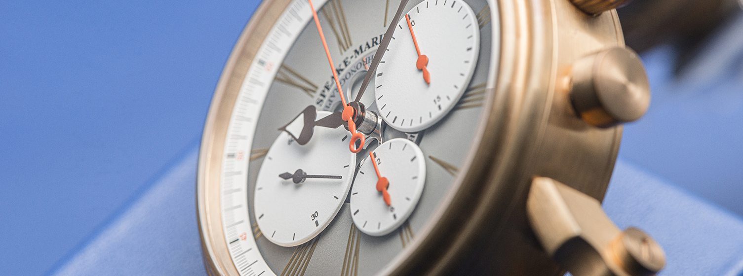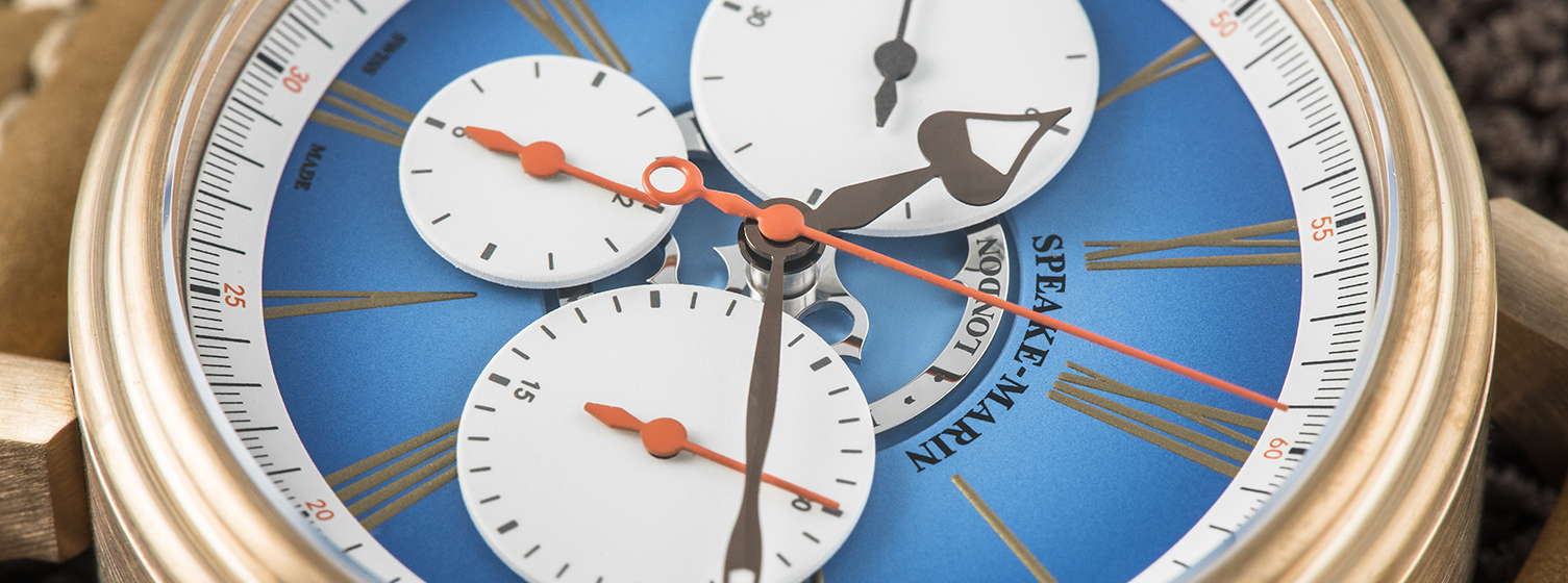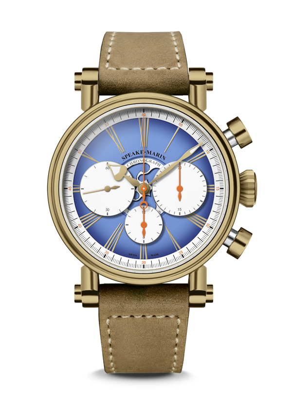 White three-dimensional dial Blue or grey face Central wheel with the Speake-Marin symbol Heart-shaped golden steel hands